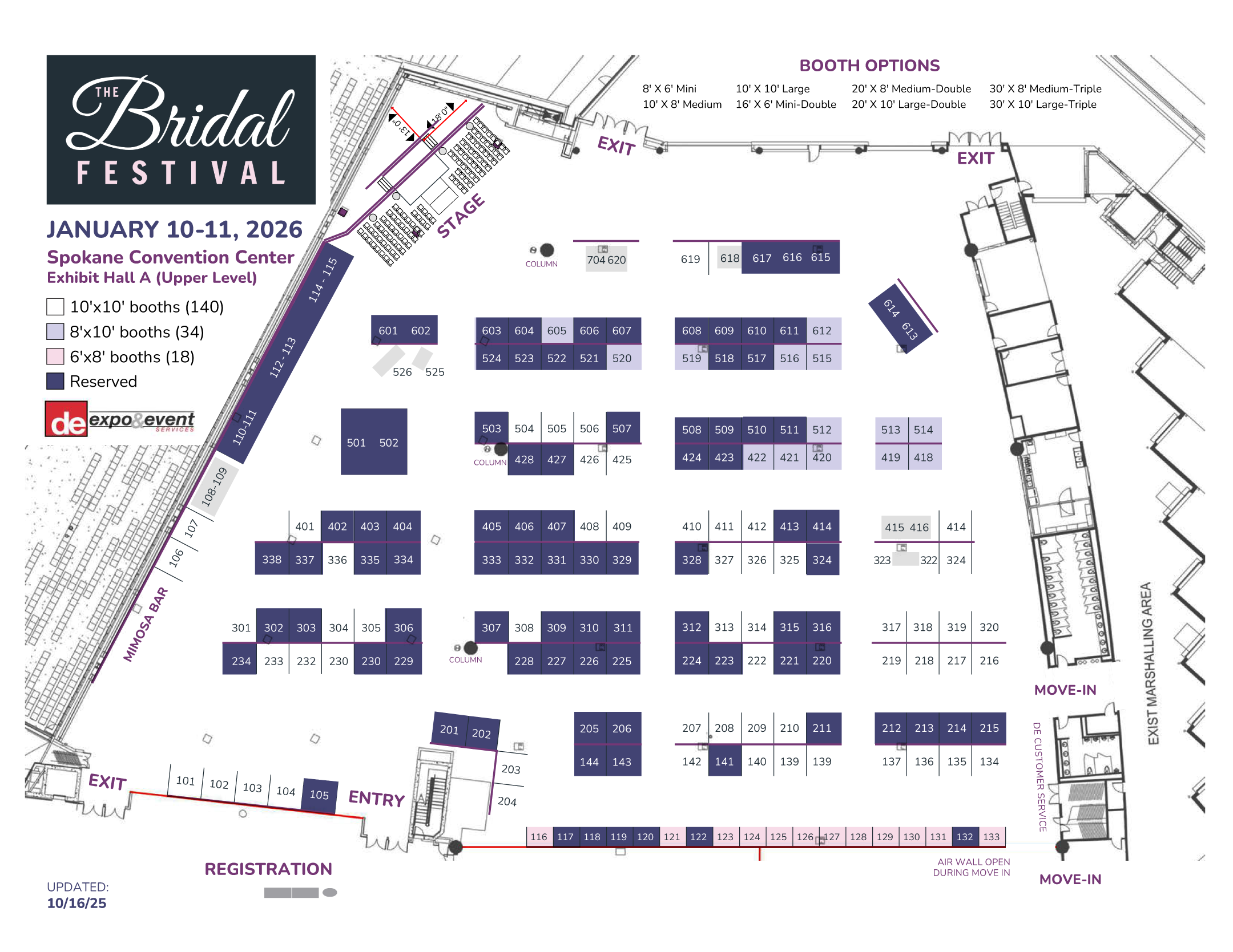 Get a head start on your 2026 Bridal Festival strategy! This floor plan of Spokane Convention Center’s Exhibit Hall A allows you to visualize your ideal location. Booths shown in dark purple have already been reserved (last updated: 10/16/25).