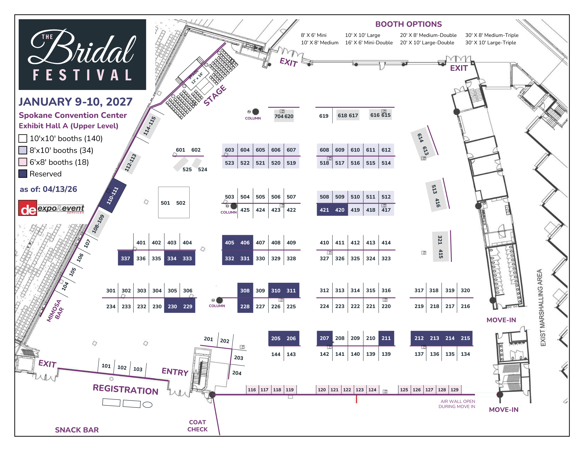 Get a head start on your 2027 Bridal Festival strategy! This floor plan of Spokane Convention Center’s Exhibit Hall A allows you to visualize your ideal location. Booths shown in dark purple have already been reserved (last updated: 04/13/26).